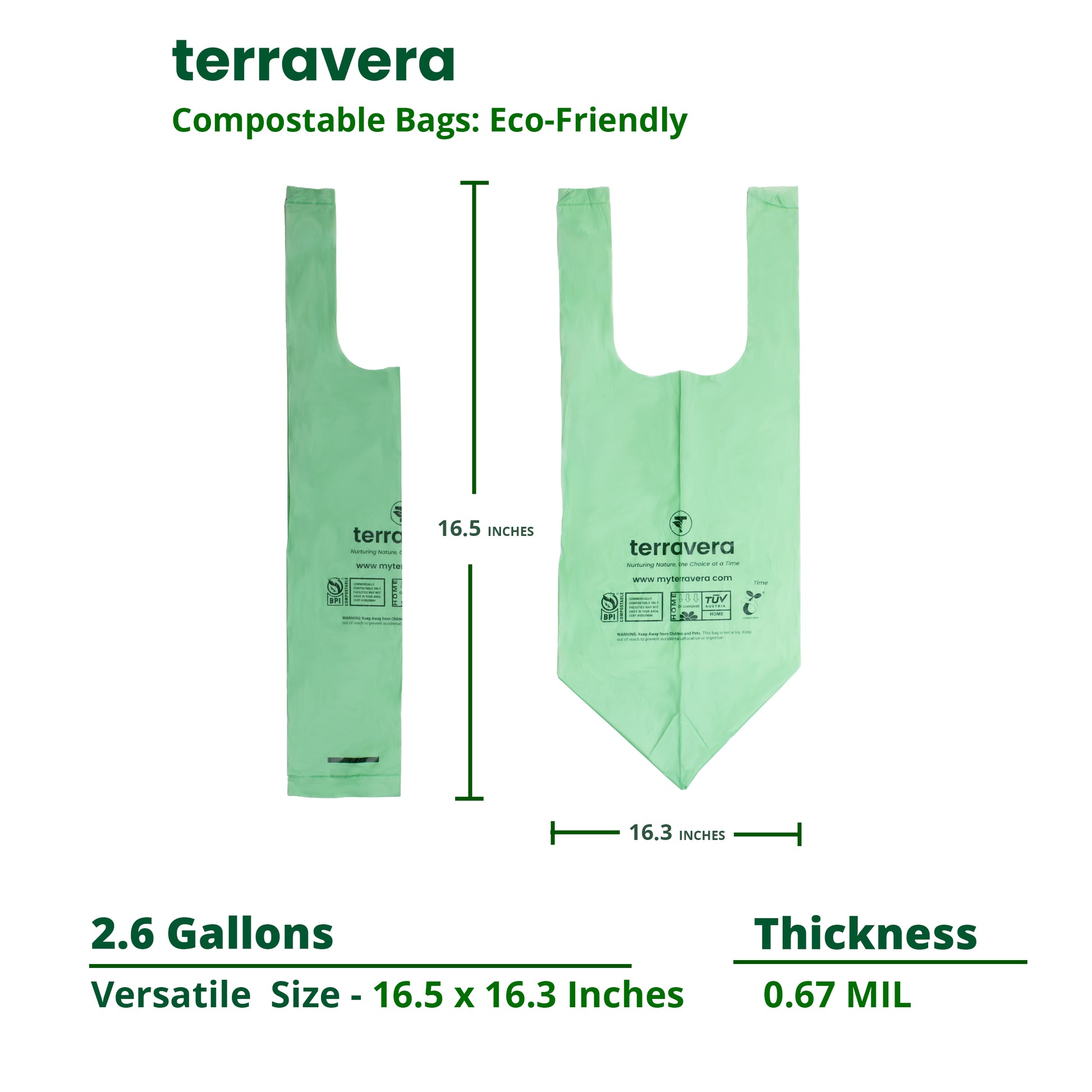 - PRODUCT INFORMATION: terravera bags, 2.6 gallon (9.84 L) 16.3 in x 22.0 in x 0.67 mil, 100 bags per roll, handle tie.